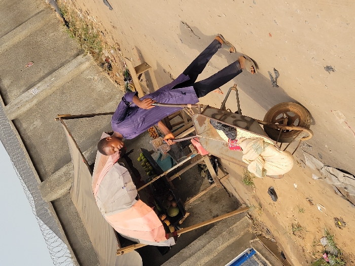 The image portrays an outdoor scene in Puerto López, Colombia, under bright daylight. A young adult male is depicted in motion, pushing a metal wheelbarrow loaded with a large, light-colored tied sack and a dark object. The wheelbarrow's side has "RIB" marked on it. The male wears a striped purple tunic, dark trousers, and light-colored sandals. To his left, a makeshift market stall is visible, constructed with wooden supports and shaded by a partially open, multi-striped umbrella (white, beige, and orange/red). The stall displays various fruits, including green, orange/brown, and yellow/green items, on a wooden surface. The background features a light grey concrete wall topped with barbed wire. The ground is an uneven, dry dirt or sandy surface with scattered debris, including a single dark shoe. A wooden bench is visible to the right of the stall.