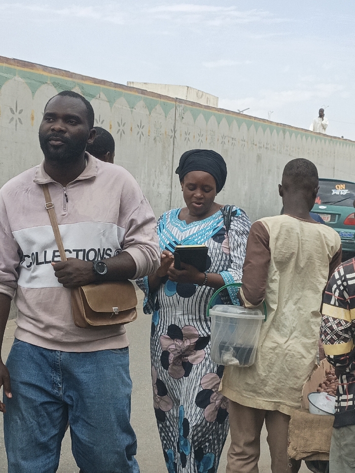 The image depicts an outdoor street scene in Fagge C, Nigeria, under an overcast sky