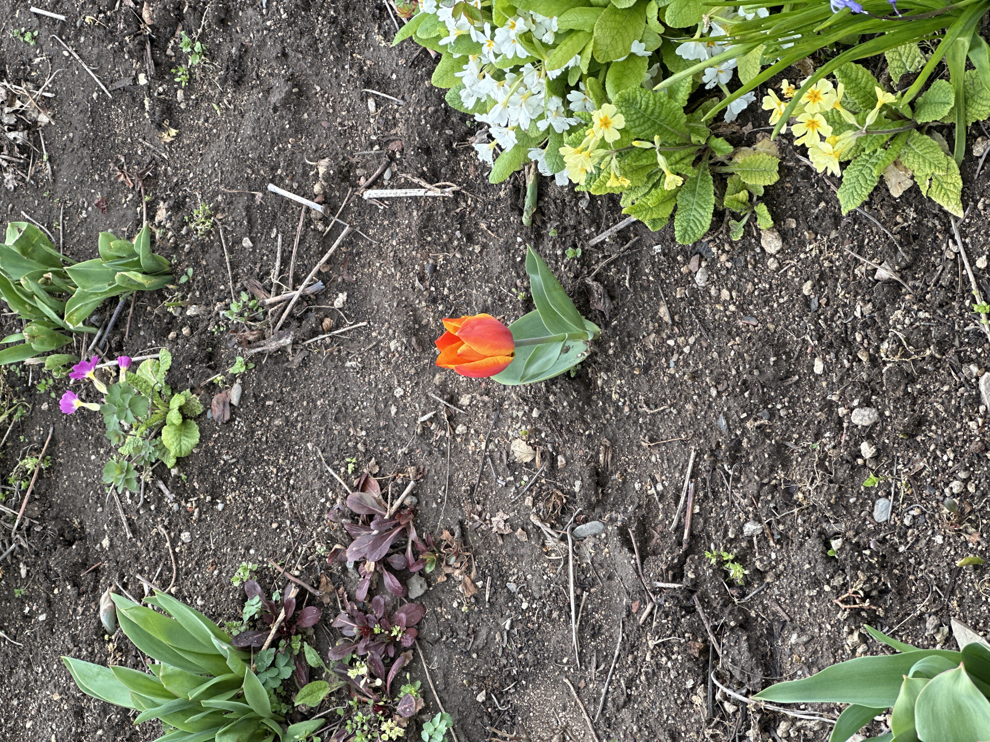 The image depicts a close-up, top-down view of a garden bed in Streltsi, Bulgaria, characterized by dark, moist soil interspersed with small pebbles and organic debris, including twigs and dried plant matter. No individuals are present. The primary subject is a vibrant orange-red tulip, centrally located, with two broad green leaves emerging from the soil. To its lower right, a dense cluster of plants displays multiple small, bright yellow primrose-like flowers with textured green leaves, alongside a group of white flowers of similar form. Thin, upright green blade-like leaves, possibly from a bulb plant, are visible on the far right, with a hint of a blue flower at their base. In the upper left quadrant, several clusters of broad, deep green leaves indicate emerging bulb plants, likely tulips. Scattered across the soil are smaller green plants, some with distinct reddish-purple leaves, and others bearing small magenta-purple flowers. The overall environment suggests an early spring garden setting.