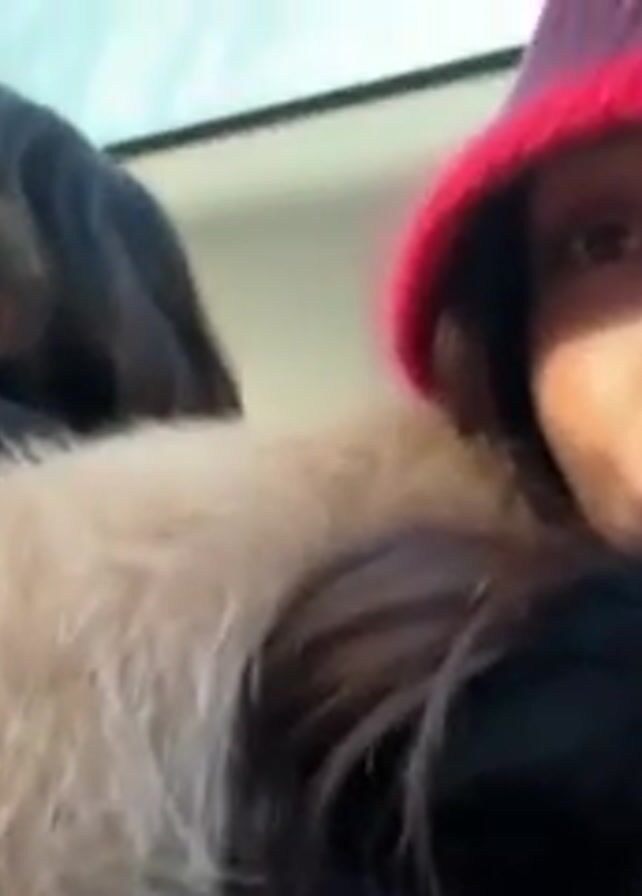 three people riding in a vehicle. The primary focus is on a woman wearing a purple and red knitted hat and a large fur coat. She is looking directly at the camera, making faces, and appears to be recording a selfie video. Behind her and to her left, another woman is visible, her head resting back, seemingly relaxed or asleep. In the far background to the left, a man wearing a baseball cap is also visible. The vehicle has a sunroof through which the sky and bare tree branches can be seen. Light streams through the sunroof, creating a bright glare in some shots.
