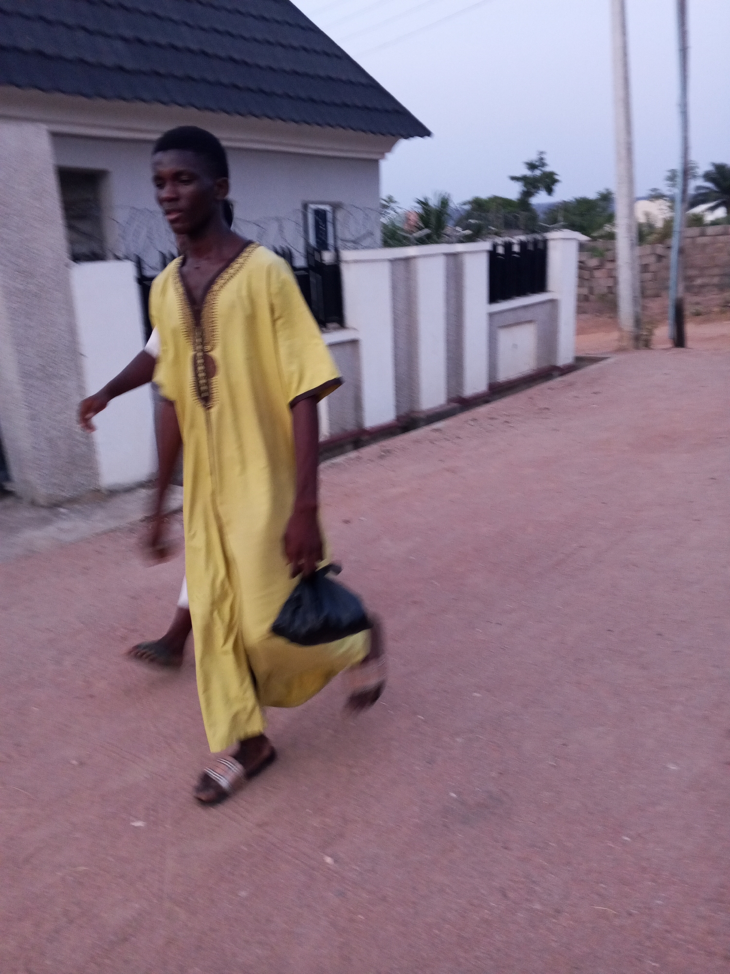 In Adonkolo, Nigeria, a young man wearing a yellow traditional robe walks on a pink paved road. He carries a black plastic bag in his right hand. He is wearing sandals. Another person is partially visible behind him. The background shows a building with a dark roof, a fence, a utility pole, and trees. The sky is overcast.