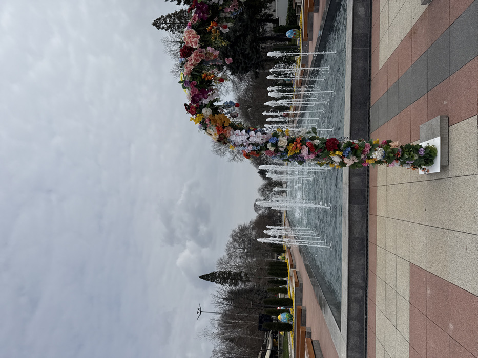 The image depicts an outdoor public plaza or park in the city of Montana, Bulgaria, under an overcast sky. In the foreground, a multi-colored artificial floral archway, composed of fabric flowers in various hues including red, pink, purple, blue, yellow, white, and green, rises from the lower right corner, curving towards the top center-left. The base of this arch rests on a square grey concrete slab on a paved surface featuring alternating square tiles of light beige, reddish-brown, and dark grey. In the midground, a long, rectangular fountain basin displays numerous active vertical water jets of varying heights against dark water. The fountain is bordered by dark grey stone coping. Adjacent to the fountain, paved pedestrian paths are visible, lined with light-toned wooden benches and small evergreen shrubs. Several large, colorful, egg-shaped decorative objects are strategically placed on grassy areas alongside the paths; a prominent yellow and blue egg is visible on the left, and a blue egg on the right. The background consists of a mix of bare deciduous trees and dark green coniferous trees, indicative of late winter or early spring conditions. A multi-headed dark street light pole is visible on the left side of the background. The sky is uniformly overcast with a layer of grey clouds. No individuals are present in the scene.