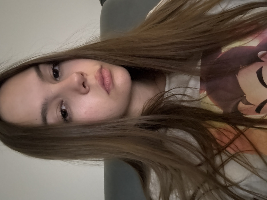 The scene is an indoor environment. A female individual, appearing to be a young adult, is depicted from the upper torso upward. She has fair skin, dark eyes, and long, straight brown hair that frames her face and falls over her shoulders. Her gaze is directed forward, and her expression is neutral, with lips slightly parted. She is wearing a light-colored t-shirt featuring a colorful graphic print of an animated character's face. A thin metallic chain is visible around her neck. The background consists of a plain, light-colored wall to the left and an upholstered dark gray sofa or chair back to the right. No actions or interactions are depicted. While the requested location is Plovdiv, Bulgaria, no visual evidence within the image corroborates this specific geographical claim.