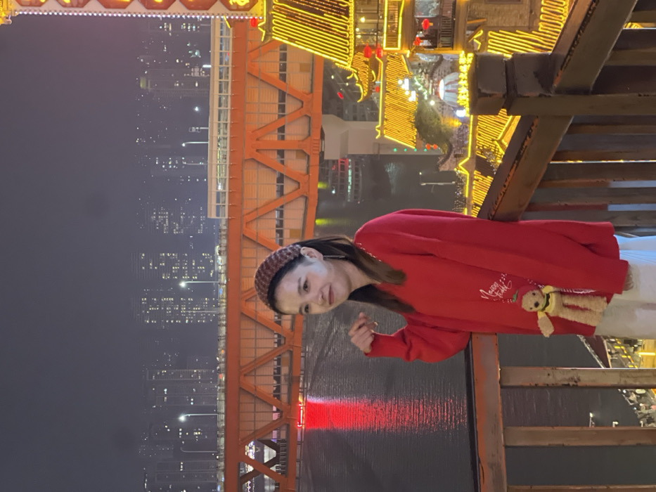 The image depicts a nighttime urban scene in Yuzhong District, Chongqing, China, specifically overlooking the Jialing River with Hongyadong Commercial Street visible on the right. A female individual, appearing to be an adult, is positioned in the center-left of the frame, facing slightly to the camera's right with her head turned towards the viewer. She has dark, straight hair and wears a brown patterned headband. Her attire consists of a long-sleeved red sweater with white embroidery on the front, and white lower garments. A small, light brown teddy bear plushie with a red cap is attached to her sweater via a striped red and white string. Her right arm is bent with the hand near her chest. She displays a slight smile. In the midground, behind the individual and a wooden railing, a large body of water reflects city lights. Spanning the water is a prominent orange truss bridge, identified as the Dongshuimen Bridge, which shows multiple levels of infrastructure. Red lights are visible reflecting from the bridge or objects on the water. To the right of the frame, a multi-tiered complex of traditional Chinese architecture, consistent with Hongyadong, is extensively illuminated with golden and red lights, including red lanterns. The background features a dark night sky above a distant city skyline with numerous illuminated high-rise buildings and streetlights on the opposing riverbank.