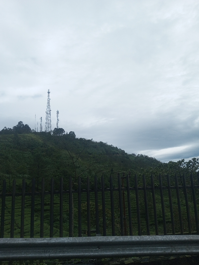 The image displays an outdoor landscape under an overcast, light grey sky. A prominent, verdant hill dominates the background and middle ground, densely covered in green vegetation, indicative of tea plantations on its lower slopes and natural foliage higher up. Positioned on the crest of this hill are at least five tall, lattice-structured communication towers of varying heights, with one central tower being notably taller. In the foreground, a dark, vertical metal palisade fence with pointed tops spans horizontally across the lower mid-section of the frame. Directly below this fence, a silver-grey metal guardrail, likely a roadside barrier, runs across the bottom of the image, showing some faint surface markings. No individuals, animals, or active movements are visible. The scene is located in the city of Ariyalai, Sri Lanka.