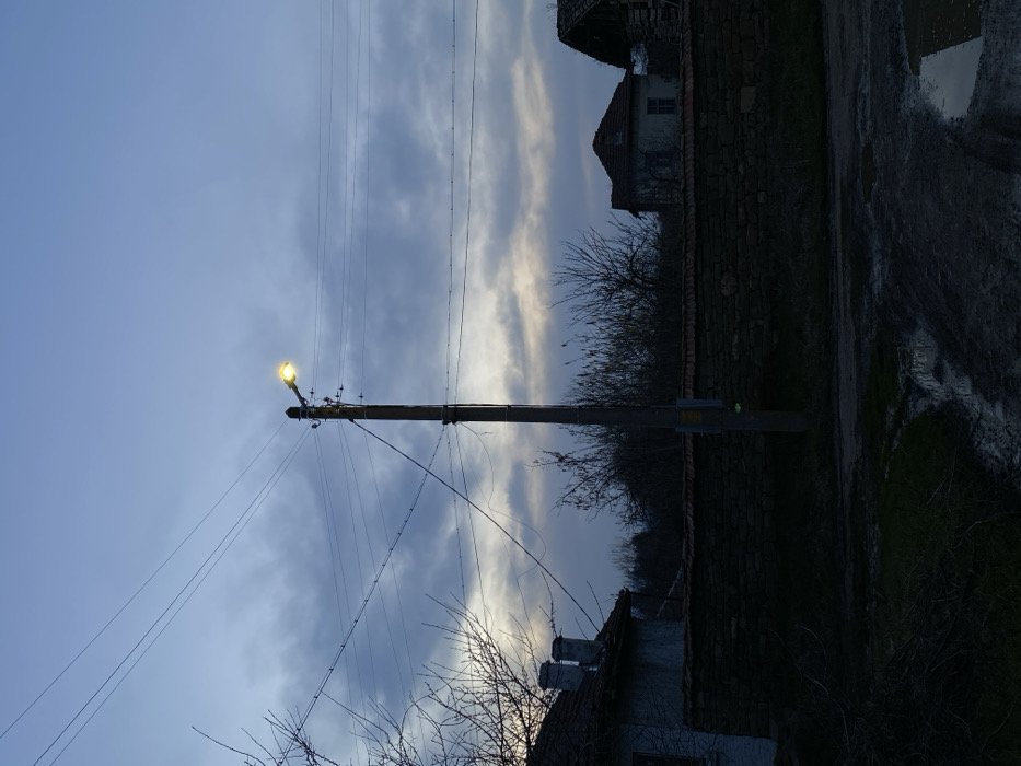 The image depicts a rural or semi-rural street scene in Dobri dial, Bulgaria, at dusk or early night, under an overcast sky