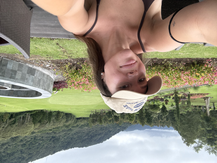 The image depicts a young adult female captured in a selfie outdoors in Wanagiri, Indonesia. She is seated on a dark wooden deck, wearing a tan baseball cap with "NEW YORK American Museum Square" text, a dark brown spaghetti strap top, and a single white pearl earring in her left ear. Her left arm displays a thin black band and a small dark tattoo. Behind her, vibrant pink and red flower beds line a manicured green lawn. To the right, a semi-circular, multi-tiered stone structure composed of dark grey rectangular tiles is visible. The background features a golf course with bright green fairways and putting greens, bordered by dense tropical forest covering a series of mountains under an overcast sky.