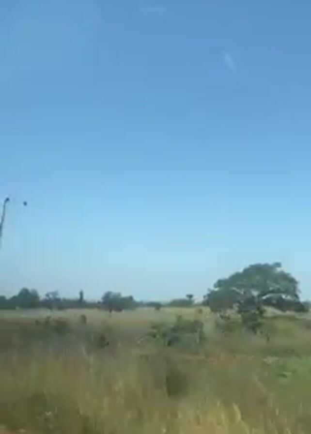 view from a moving vehicle, likely a car, driving along a dirt road through a grassy field. The field has scattered trees and bushes. Power lines are visible overhead against a clear blue sky. The focus is on the landscape passing by.