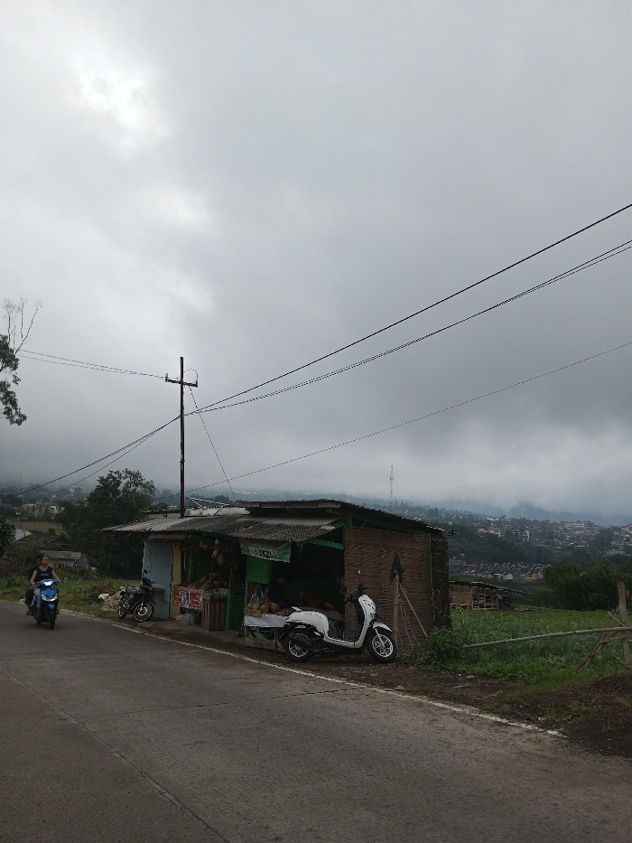 The image displays a roadside scene in Ambakirano, Madagascar, under a heavily overcast, grey sky. A paved road extends from the lower left to the right foreground, curving slightly. In the mid-ground, on the left side of the road, a person wearing a dark top rides a blue scooter, traveling from left to right. Adjacent to the road on the right, a single-story, rustic roadside shop with a corrugated metal roof is visible. The shop's facade features sections of light blue and green paint, and merchandise, including what appears to be coconuts or melons in sacks and hanging items, is displayed at the front. A dark motorcycle is parked in front of the shop, and a white scooter is parked further to its right. At least one individual is partially visible inside the shop, obscured by the displayed goods. A dark utility pole with a horizontal crossarm stands just to the left of the shop, supporting multiple overhead power or communication lines that extend across the upper portion of the frame. To the right of the shop, a simple wooden fence borders a green, cultivated area. The background features a sprawling settlement of buildings across hillsides, partially obscured by a thick layer of clouds or mist. A distant communication tower is discernible on a higher peak in the hazy background.