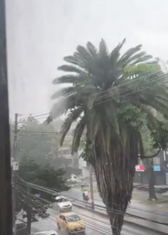 From a window, a scene unfolds in the pouring rain. A large palm tree stands prominently, its fronds swaying in the wind. Below, a street is slick with water, with cars and motorcycles traversing the wet road. Power lines stretch across the sky, adding to the urban environment. Raindrops streak the window, blurring the already muted colors of the overcast day. The overall atmosphere is damp and gray.