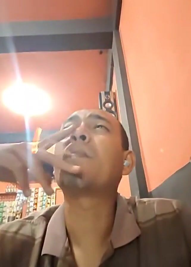 man inside a room. The room appears to be a small shop or cafe, with shelves of snacks and drinks visible in the background. The walls are painted orange, and the ceiling is partially visible, with a black and white grid pattern. The man is wearing a brown, patterned shirt. He is looking directly at the camera, smoking a cigarette, and then sticks out his tongue and blows smoke in the air. He has short hair and a light complexion. A bright light source is visible above him, and there is a speaker mounted on the wall in the background.