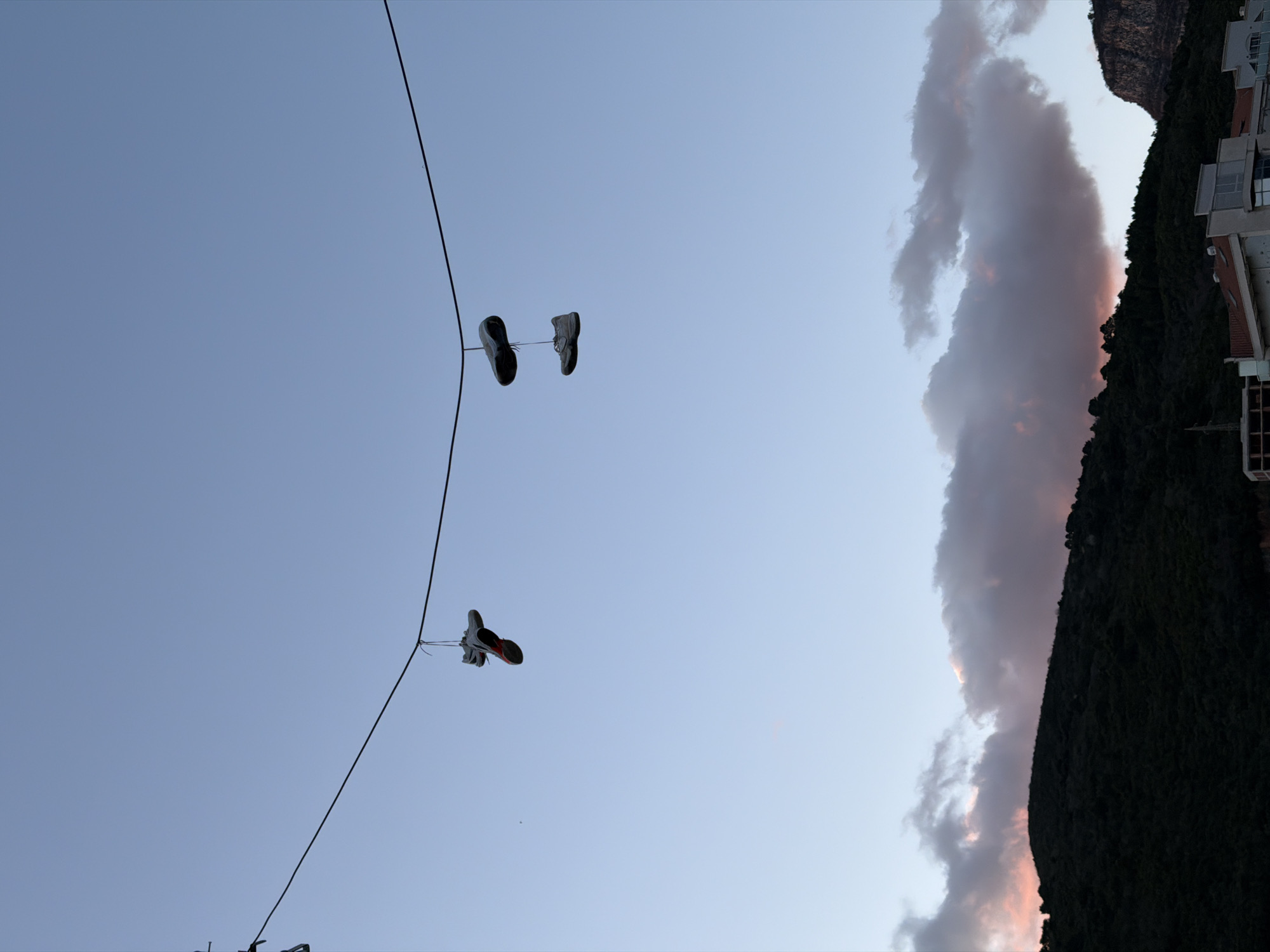 - "A low-angle shot shows two pairs of shoes hanging from a thin cable stretching across the sky, with a mountain and clouds in the background" by FM-IXUoX2, licensed under CC BY 4.0