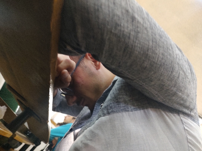 The image presents an indoor scene, possibly a classroom or lecture hall, focused on an adult male from a low, upward-angled perspective
