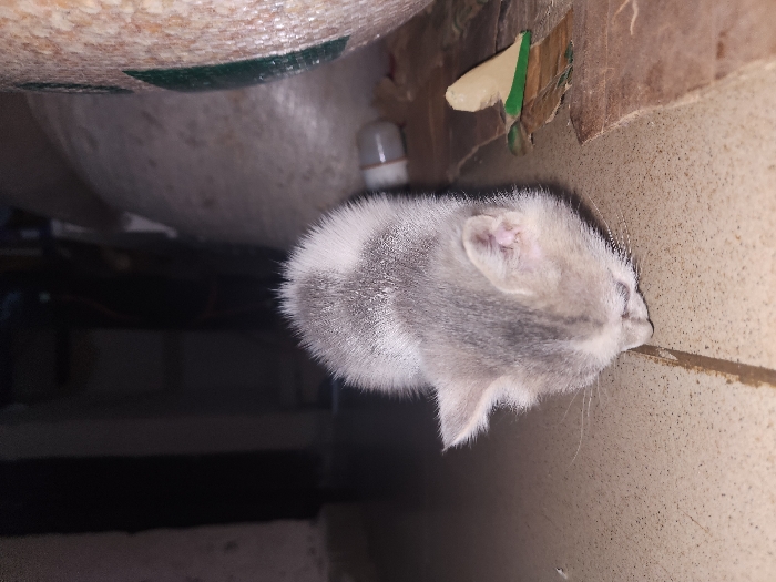 The scene, set in an indoor or sheltered area within the city of Unknown, Unknown, features a small, juvenile feline (kitten) with grey and white fur