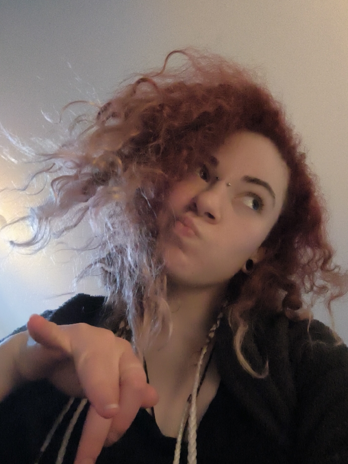 A young individual with light skin, voluminous, curly reddish-brown hair with lighter strands, is depicted indoors in the city of Unknown, Unknown. The subject's face is characterized by a pouting expression, eyes gazing upward and to the right, a silver barbell piercing on the nasal bridge, and a black tunnel earring in the left earlobe. They are wearing a dark top beneath a dark, textured outer garment, with several light-colored braided elements visible around the neck. The subject's right hand is extended forward, with the index finger pointing directly towards the viewer and the thumb raised, forming a hand gesture. The background consists of a plain, light-colored interior surface, illuminated by diffuse light.