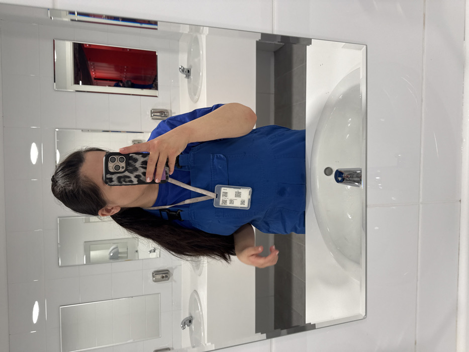 A female subject is depicted in a mirror selfie within a public restroom or changing facility in the city of Sof'ino, Russia. The individual, visible from the chest up, possesses long, dark hair styled in a ponytail and wears a blue t-shirt beneath blue overalls. An identification badge, enclosed in a clear holder displaying multiple QR codes, is suspended from a light-colored lanyard around her neck. She holds a smartphone, featuring a leopard-print case, in her left hand, partially obscuring her face from the nose down. Her right hand is partially visible at waist height. The environment consists of white tiled walls, multiple white ceramic sinks with chrome faucets on white counters, and recessed overhead lighting. Reflections within the various mirrors reveal a silver hand dryer to the left and a series of red lockers or cabinets to the right, indicating a connected changing area.
