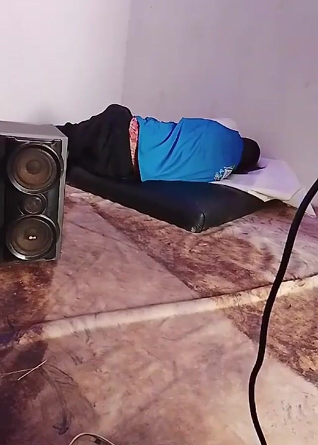 person lying face down on a mattress on the floor, with a large speaker next to them. The person is wearing a blue shirt and black pants. The mattress appears to be on top of a larger, patterned sheet or blanket. A cable is visible in the bottom right corner of the frame. The room has plain white walls.
