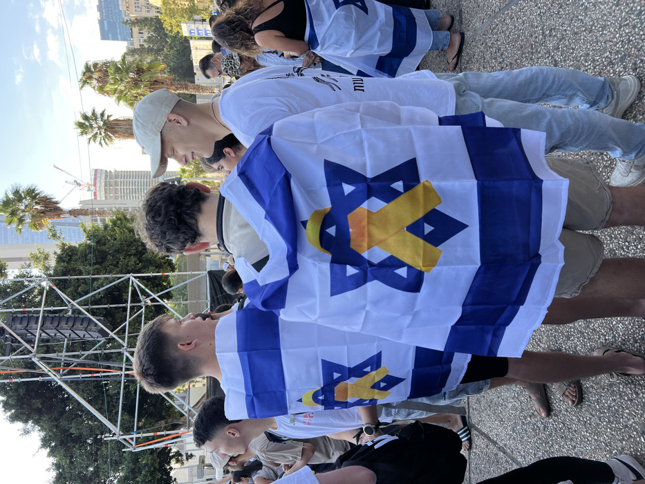 The image captures a crowded outdoor scene during daytime, likely in Rabin Square, Tel Aviv, Israel. The foreground features three young adult males. Two central figures have Israeli flags draped over their backs, each flag depicting the blue Star of David on a white field between two horizontal blue stripes, centrally overlaid with a yellow ribbon. The figure to the far right is seen in profile, smiling, wearing a light-colored baseball cap and a white t-shirt. Another individual on the far right also has an Israeli flag draped over their back. The surrounding area shows numerous other people gathered, indicating a public event or demonstration. In the background to the left, a large metal scaffolding structure, possibly supporting sound equipment or a screen, is visible amongst green foliage. Further in the background, multiple palm trees and modern high-rise buildings, some under construction with cranes, are present, consistent with Tel Aviv's urban environment.