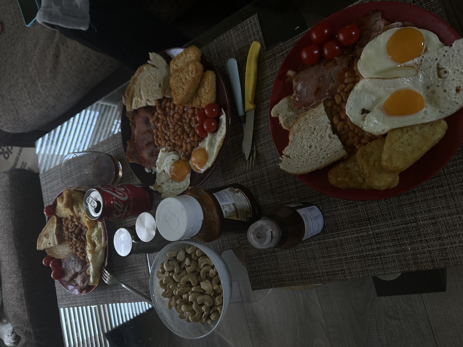 This image depicts an indoor scene in Dorchester, United Kingdom, focusing on a dark-surfaced coffee table presenting three individual breakfast servings. The top-left plate, reddish-brown, holds bacon, baked beans, two slices of toast, and five cherry tomatoes. A silver fork is positioned on this plate. The middle-right plate, brown, contains bacon, baked beans, two slices of white bread, two fried eggs with intact yolks (sunny-side up), five cherry tomatoes, and two hash browns. The bottom-right plate, red, displays bacon, baked beans, two slices of white bread, two fried eggs with intact yolks (sunny-side up), four cherry tomatoes, and three hash browns. A silver fork and a knife with a yellow handle are placed beside this bottom-right plate. To the left of the table, a white bowl is filled with unshelled cashew nuts. Adjacent to the bowl are two silver-colored shakers, likely for salt and pepper. An open red Coca-Cola can and an empty, clear glass tumbler are situated near the center of the table. Two brown condiment bottles are also present: a larger one with a white cap and a smaller one with a darker cap. In the background, a light-colored sofa with a dark throw is visible. A partial view of an animal, consistent with a domestic dog, rests on the sofa in the upper left corner. Natural light, entering from a window with horizontal blinds, casts distinct striped patterns across the table surface and the light-colored floor. No human figures are visible.