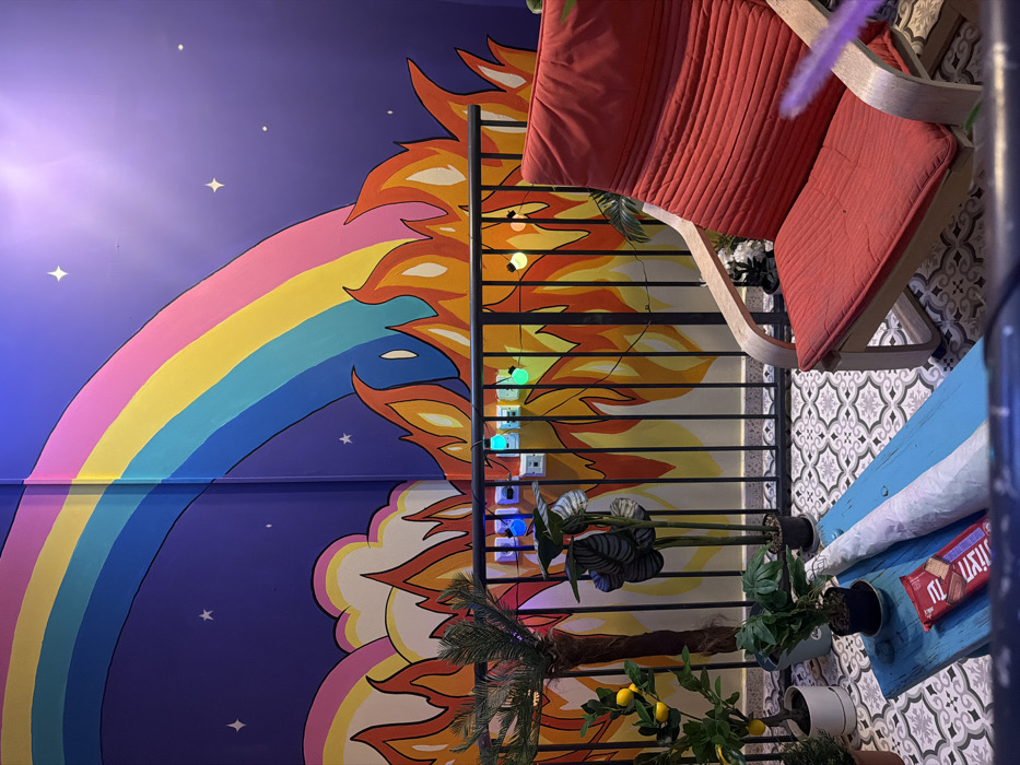 The image depicts an outdoor patio or balcony, asserted to be located within the city of Tel-Aviv, Israel, though a specific address or neighborhood is not visually identifiable from the scene. The background wall features a vibrant mural with a purple sky, scattered white stars, and a large rainbow arching across the upper right in pink, yellow, blue, and light pink/purple stripes. The lower half of the wall mural displays stylized orange and yellow flames with black outlines, with white and yellow cloud-like shapes present above the flames on the left. A black metal railing with vertical bars runs horizontally across the mid-ground. A string of multi-colored LED lights (blue, green, yellow, orange, white) is strung along this railing. Several white electrical outlets are visible on the wall behind the railing. The foreground consists of a floor covered with patterned tiles featuring a light background with grey and black geometric designs. Various potted plants are arranged on the floor: a medium-sized artificial palm tree, a smaller artificial lemon tree bearing yellow fruit, a taller plant with striped green and white leaves, and other smaller green plants. To the right, a wooden-framed reclining chair is present, fitted with a ribbed, reddish-orange fabric cushion. In the center foreground, a small, rustic wooden table, painted light blue, holds two items: an elongated white object, possibly a rolled textile, positioned diagonally, and a red-wrapped snack package. The snack package displays Hebrew text, including 'הכיף' (Hakeif). No individuals or active interactions are visible in the scene.