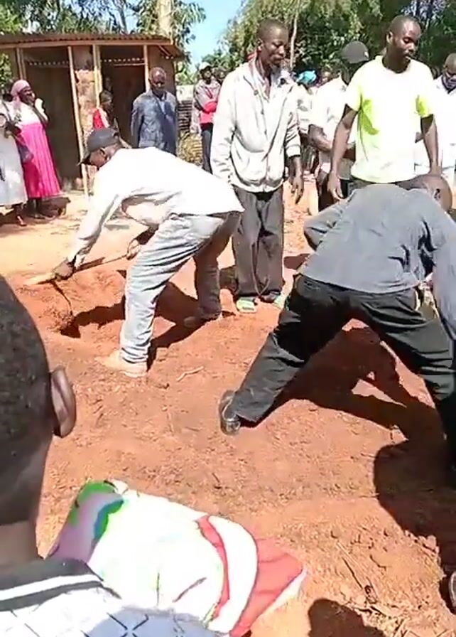 The scene is a dirt clearing where a crowd of men are gathered around a rectangular hole in the ground. Two men are inside the hole, digging with shovels. Most of the other men are standing around watching. One man has his arms crossed behind his back. A young boy stands near the front of the crowd with his back to the camera. In the background is a small wooden structure with a tin roof. There is a musical accompaniment playing.