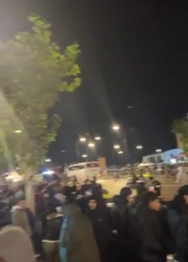 large crowd of people at night on a city street. The crowd is densely packed, with people standing close together. Many individuals are wearing jackets and hoodies, indicating a cooler temperature. Streetlights illuminate the scene, casting a bright glow on the crowd and surrounding buildings. There are buildings visible in the background, suggesting an urban setting. In the distance, there are vehicles moving, potentially indicating traffic. The general atmosphere seems like a gathering or event taking place at night.
