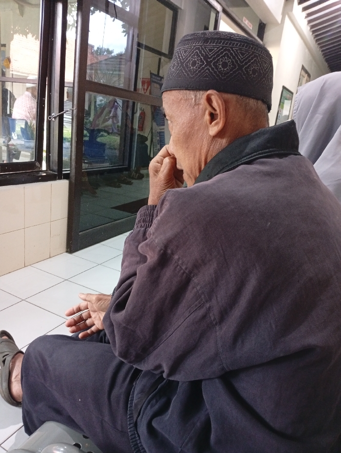 An elderly man wearing a patterned black cap and dark jacket sits with his back to the viewer. He is looking out of a window with a somber expression. His hand is near his face, possibly touching his nose or mouth. He is dressed in dark clothing, including pants and sandals. The setting appears to be a waiting area with tiled floors and a view through the window of an exterior space.