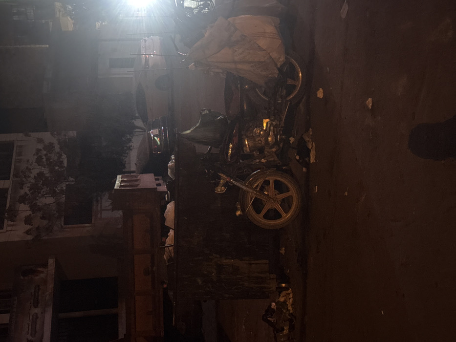 This nocturnal image captures an urban street scene in At-Tall, Syria. In the midground, a dark-colored motorcycle with gold-colored five-spoke wheels is parked, featuring a large, light-colored bag draped over its rear and a darker bag on its front section. To the immediate left of the motorcycle stands a large, dark-colored dumpster, visibly overflowing with various refuse. Behind the dumpster, a dark-colored dump truck is parked. Further in the background, on what appears to be a paved road, two passenger sedans are visible: a dark-colored vehicle facing left, and a lighter-colored vehicle facing right. Multi-story buildings with dark windows and some sparse vegetation occupy the background. The foreground consists of a dark ground surface, scattered with small pieces of debris. A bright, artificial light source is present on the far right, causing a pronounced lens flare. No individuals are visible.