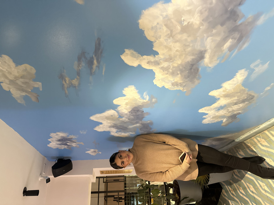 A woman wearing a tan sweater and black pants leans against a wall decorated with a blue sky and cloud mural