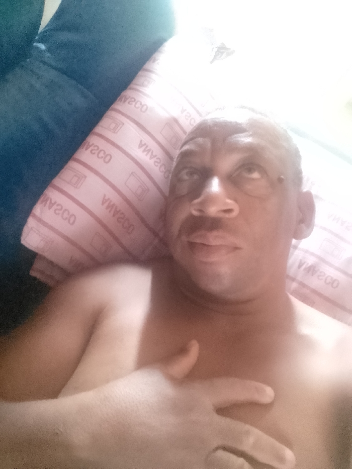 This image depicts an adult male from the mid-chest upwards, lying down in an indoor setting in Narayi, Nigeria