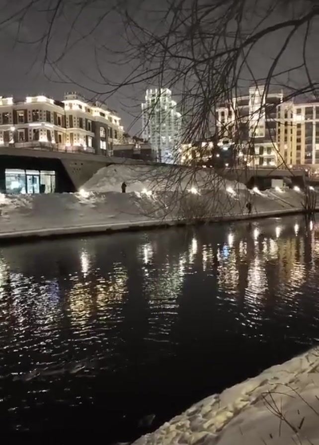 nighttime view of a river flowing through a city. On the opposite bank, several buildings with illuminated windows are visible, their lights reflecting in the water. Snow covers the ground along the riverbank. In the foreground, bare tree branches partially obscure the view. Two figures can be seen walking along the snow-covered bank, and a few objects appear to be floating on the surface of the water. The sky is overcast.