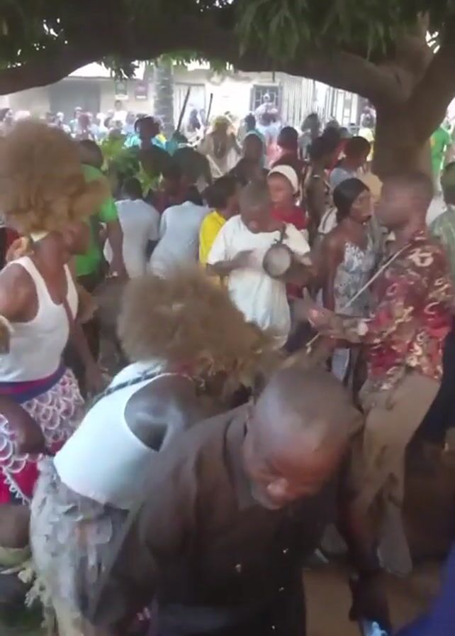 The video depicts a lively outdoor scene with a crowd of people gathered under a tree. The focus is on two male dancers wearing white tank tops, patterned skirts, and large, afro-like headpieces. They are actively dancing, moving their bodies energetically. Behind them, the crowd is a mix of adults and children in various casual clothing. Some people in the crowd are moving and dancing, while others watch the performance. There's a sense of celebration or cultural event taking place. The area appears to be somewhat open, with glimpses of buildings in the background. The lighting suggests it's daytime but possibly overcast.