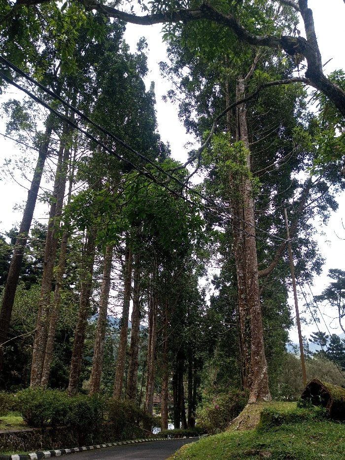 The scene is located in Padegaon, India. It depicts a verdant outdoor environment dominated by a dense arrangement of tall, slender trees with green foliage, extending upwards towards a light, overcast sky. A dark, asphalt-paved road with a white and black striped curb on its left edge curves from the lower-left foreground towards the center-midground. Green grass and low-lying bushes line both sides of the road. Several dark utility lines, likely electrical or communication cables, are strung horizontally through the upper-middle portion of the image, intersecting with the tree canopy. The prominent tree in the right foreground exhibits exposed roots at its base and textured bark. A moss-covered log or tree section lies horizontally in the lower-right. In the distant background, obscured by tree trunks, faint outlines of hills are visible. No human or animal subjects are present, and no specific actions are occurring.