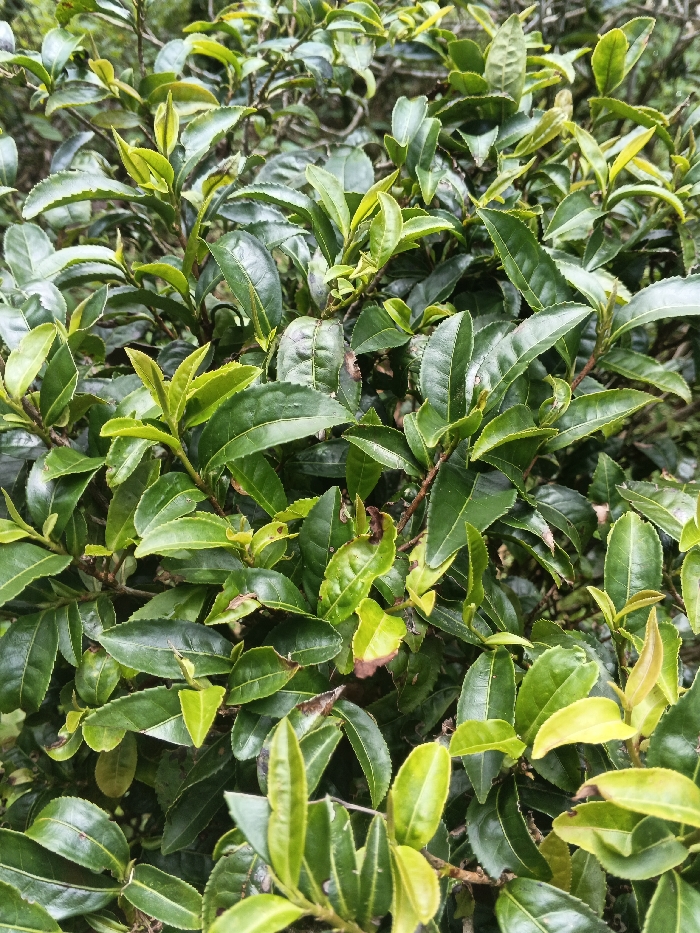 Lush greenery dominates the scene, featuring densely packed, glossy leaves of varying shades of green. The leaves display a distinct vein pattern and smooth edges. New growth is apparent with lighter, yellowish-green leaves budding at the tips of branches. A few leaves exhibit minor imperfections, such as browning edges or spots, adding to the natural aesthetic. The overall impression is a thriving, verdant bush.