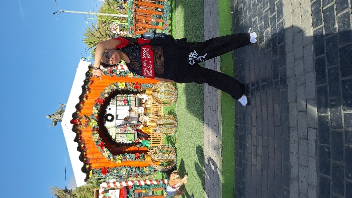 A person stands near a decorated Christmas display. The display is adorned with ornaments and lights, resembling a house. The person is wearing black pants, a black top with red accents, and white socks. They are holding one arm up. The ground is covered in green turf and brick paving. A statue is visible atop the display. The sky is blue.