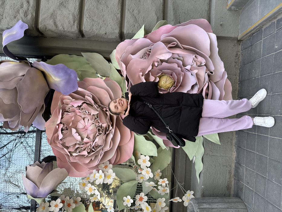 A female subject stands centrally on a grey tiled sidewalk in front of a building facade on Dmytro Yavornytsky Avenue in Dnipro, Ukraine. She is wearing a black puffer jacket, light purple sweatpants, and white athletic shoes. A black cross-body bag with a silver chain strap hangs over her left shoulder. Her light-colored hair is pulled back. Her face is directed towards the camera, displaying an upward curve at the corners of her mouth and slightly narrowed eyes. Her hands are positioned with palms facing upwards, fingers curled, resting against the underside of her chin. Behind the subject is a large outdoor floral art installation. This installation features several oversized artificial flowers, prominently including large pink peonies and lavender irises, interspersed with clusters of smaller white flowers with yellow centers and green leaves. The floral elements are affixed to a surface that reflects tree branches and a bright sky, suggesting a large window or glass panel behind them. To the right of the subject and the floral display, a grey building wall with visible stone or paneling details is present. A cylindrical grey planter is partially visible on the far left of the frame. Towards the bottom right, grey concrete steps lead upwards.
