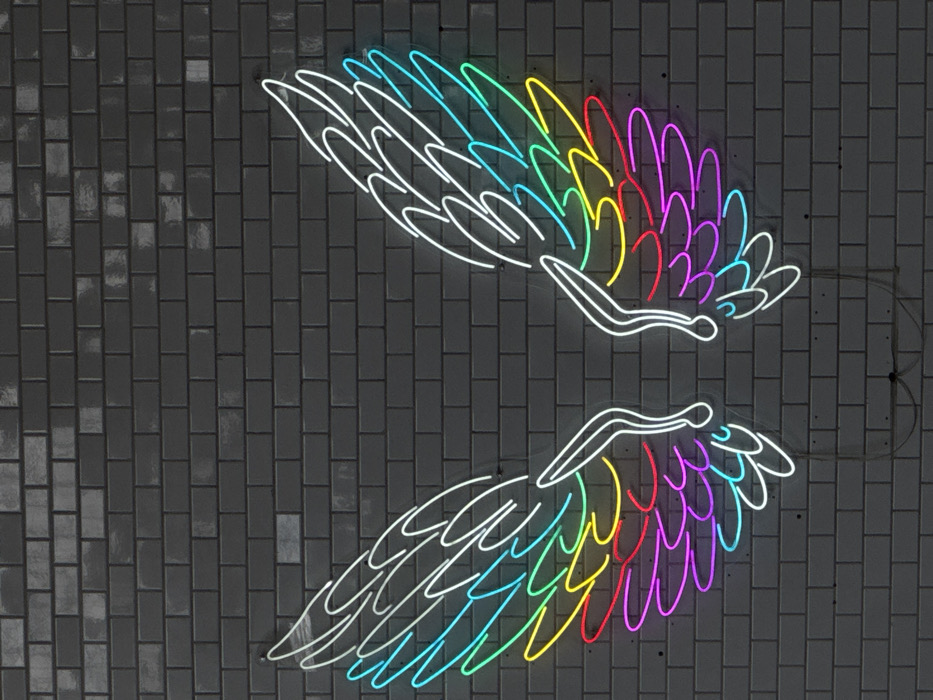 A pair of illuminated neon wings is mounted centrally on a dark grey, rectangular brick wall