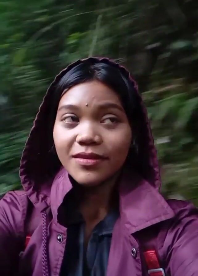 young woman walking in a forest. The woman is wearing a maroon jacket with the hood up, a gray shirt, and appears to have white headphones in her ears. The camera is pointed at the woman’s face as she moves through the forest. The background is a blur of green trees.