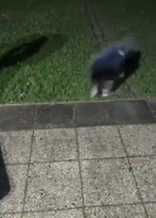 A dog fetches a ball in a backyard at night. The camera is at ground level and the dog is small, with black and white fur. The camera moves slightly as the dog runs on the grass, retrieves a small orange ball, and then walks back onto a gray tiled surface toward the camera. A swing set is in the background.