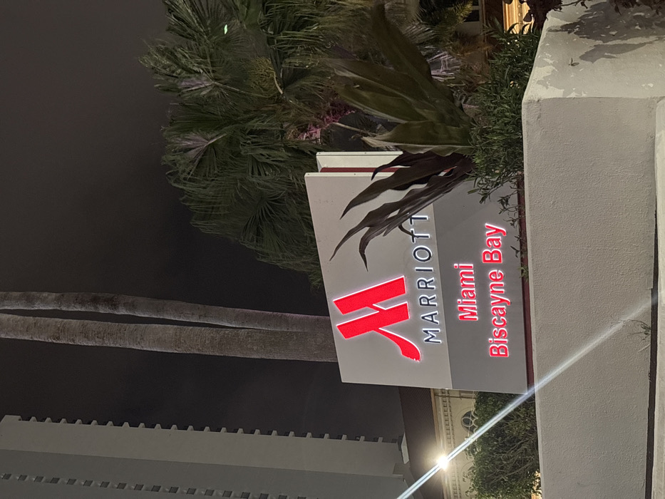 The image displays an outdoor night scene in Miami, United States of America, specifically at the Marriott Miami Biscayne Bay hotel