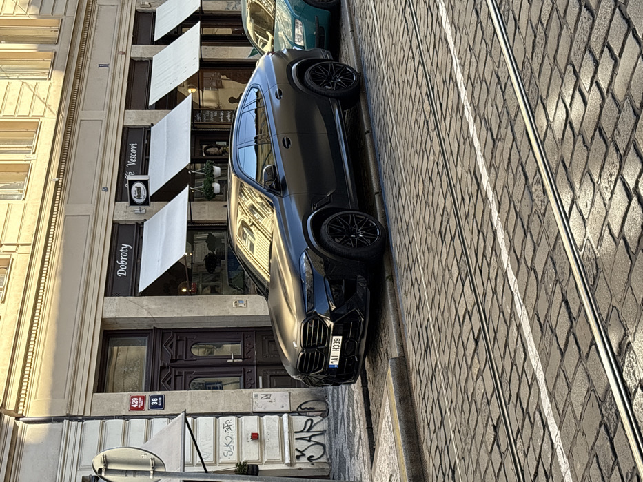 This image captures a static street scene in the Capital City of Prague, Czechia, identified by the "Praha" inscription on a street sign and the Czech license plate "1AI H339" on the primary vehicle. The scene depicts a matte black BMW X6M (G06 generation) SUV coupe parked parallel to the curb on a cobblestone street. The vehicle features dark-tinted windows and black multi-spoke alloy wheels. Strong sunlight reflects off its hood and roof. To the rear of the BMW, the front passenger side of an older, green car is partially visible. The street is paved with cobblestones and features two sets of parallel tram tracks running longitudinally. A cobblestone sidewalk borders a multi-story building on the left. The ground floor of this building houses commercial establishments with large glass display windows and extended white retractable awnings. Signs identify two businesses: "Dobroty" and "Café Vescovi". Hanging potted plants are visible in front of the shop windows. To the left of the "Dobroty" storefront, a dark brown wooden double door is situated below a red and white street sign indicating "429" and "36". The building's light-colored facade shows some graffiti near a slender metal pole on the left. No individuals are clearly discernible in the foreground or midground.