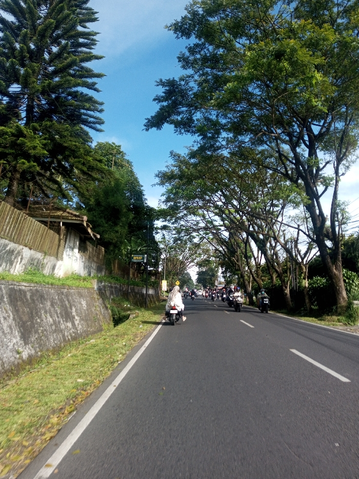 The image displays a street in Phonengam, Laos, under a clear blue sky. An asphalt road, marked by a solid white edge line on the left and a dashed white center line further ahead, proceeds into the distance. On the left, a weathered concrete retaining wall runs parallel to the road, topped by a wooden fence and dense green foliage, including tall conifer trees. A narrow concrete drainage ditch is situated between the road and the wall. A black street sign with yellow "BPJP" text is affixed to a pole above the retaining wall. The right side of the road is bordered by large deciduous trees with full green canopies, forming an overhead arch. Multiple motorcycles and scooters are traveling away from the viewer in both lanes. In the mid-ground, a person dressed in a white long-sleeved top and a light head covering operates a white scooter in the left lane.