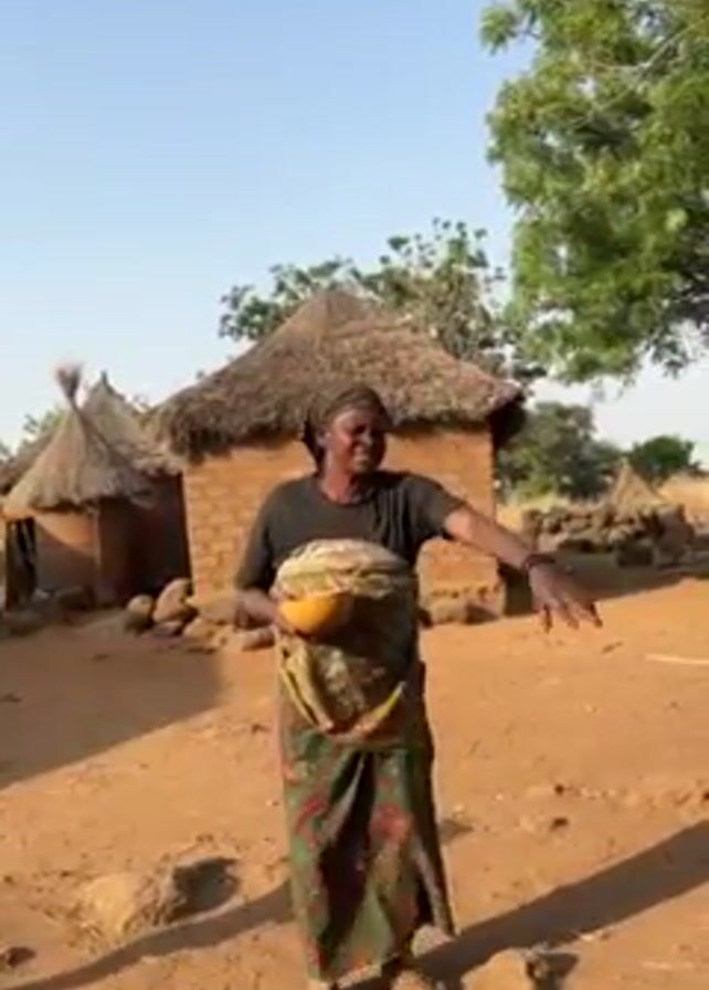 A woman is the focal point of the video, standing outdoors with a bowl held in her arms. Her dark hair is pulled back, and she's wearing a dark top and a colorful patterned skirt. A cloth is wrapped around her upper body, possibly holding something. She appears to be speaking or singing, looking upwards. The setting is a rural area, evident from the traditional mud huts with thatched roofs in the background. A leafy tree is to her right, and the ground is dry and reddish-brown. The sky is clear and bright, suggesting it's daytime. The video focuses on the woman as she engages in what seems like a performance or address, likely taking place within her village.