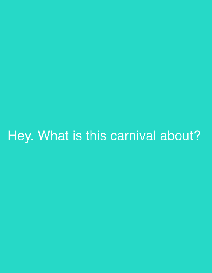 The image displays a solid teal-colored background. Centered at the bottom of the frame, white sans-serif text reads: "Hey. What is this carnival about?" The visual content of the image does not depict any specific physical location in the city of Milan, Italy. No people, subjects, objects, actions, or interactions are present in the scene portrayed. The environment is uniformly digital, characterized solely by a monochromatic background and text overlay.