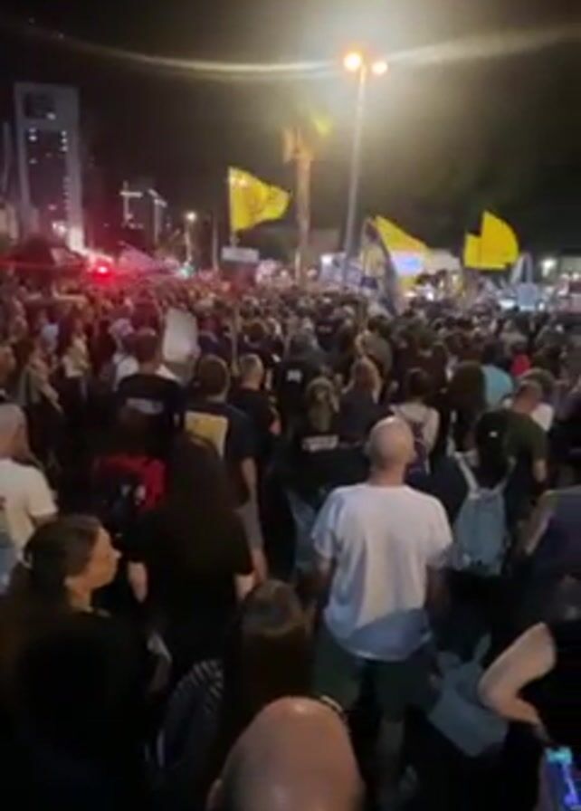 large crowd gathered outdoors at night, likely a demonstration. People are packed closely together. Some are carrying yellow and white-and-blue flags. There are streetlights illuminating the scene. The crowd appears to be moving forward slightly, and there are some buildings visible in the background. Sounds of cheering and voices can be heard in the video.