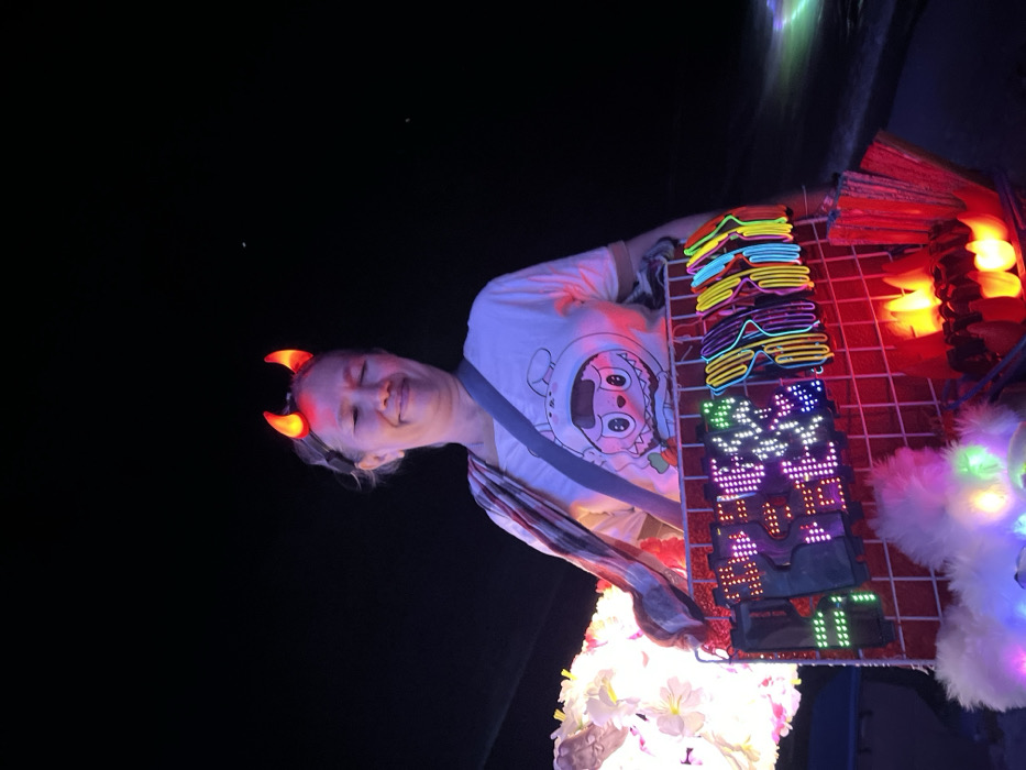 A smiling woman with illuminated devil horns stands behind a display of light-up merchandise at night. The display includes neon sunglasses, pixelated text, and glowing plush items. A white shirt featuring a cartoon character and a patterned scarf are visible. The background is mostly dark, emphasizing the bright lights of the display.