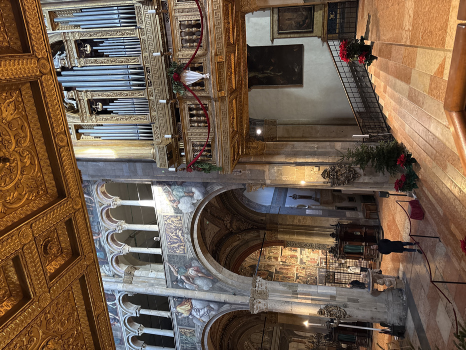 This image depicts the interior of the Cattedrale di Santa Maria Assunta (Parma Cathedral) in Parma, Italy. The scene presents a wide view of the cathedral's nave or side aisle, characterized by monumental Romanesque architecture and rich ornamentation. A gilded, intricately carved coffered ceiling dominates the upper portion of the frame, featuring geometric patterns and rosettes. Below the ceiling, on the left, a series of arched openings form an upper gallery or triforium, supported by slender white columns. Sunlight penetrates these arches, casting bright areas. Beneath the gallery, a frieze section is adorned with frescoes depicting figures on cloud formations, separated by decorative elements. Further down, large stone arches open into adjacent areas, their surfaces also covered with extensive frescoes. Massive stone columns with decorative capitals delineate these architectural features. On the right side of the image, a large pipe organ is prominently displayed, elevated on an ornate gilded balcony. The organ features numerous silver pipes arranged symmetrically within a richly carved wooden casing, detailed with a Greek key pattern. Below the pipes, the organ's balustrade is festively decorated with red velvet ropes draped between posts, interspersed with green garlands and a central white fabric ornament. Multiple lit candles are visible on the balustrade. In the right foreground, a broad staircase descends towards the nave floor. The steps are constructed from polished marble tiles in alternating reddish-brown and tan hues, creating a patterned surface. A dark metal railing lines the staircase. Above the staircase landing, below the organ, a large, dark-toned painting hangs on a cream-colored wall, with a smaller, vertical painting to its right. The floor of the cathedral is paved with large, patterned marble tiles in similar reddish-brown and tan tones. In the mid-ground, a lone male figure stands facing away from the viewer, clad in a dark jacket and trousers, observing the cathedral's interior. Further back and to the left, near massive columns, several dark wooden confessionals or church furniture pieces are visible. A few additional, indistinct figures are present in the background near these structures. Throughout the foreground and mid-ground, festive decorations are placed, including several pots of red poinsettias on the steps and floor, and two small evergreen trees positioned near columns and the staircase railing. Wall sconces with lit candles are affixed to several columns. Red velvet ropes on stands delineate sections of the floor, suggesting restricted access.