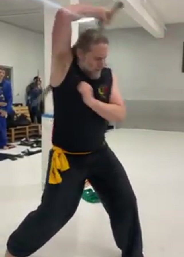 Here's a plain text description of the video: A man is practicing martial arts with a sword in a gym