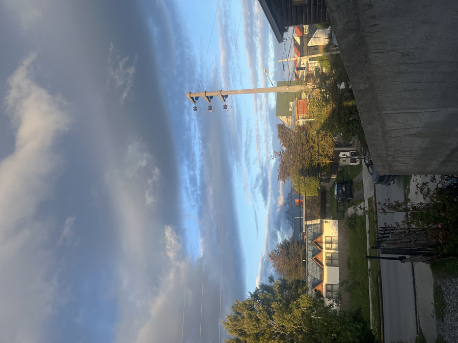 A sideways view of a street with houses, trees, and cars. A utility pole stands tall against a cloudy sky with patches of blue. The sky transitions from light blue to dark grey clouds. A concrete structure partially blocks the view on the right. Houses and trees line the street, with a black car visible. The composition focuses on the contrast between the sky and the urban elements below.