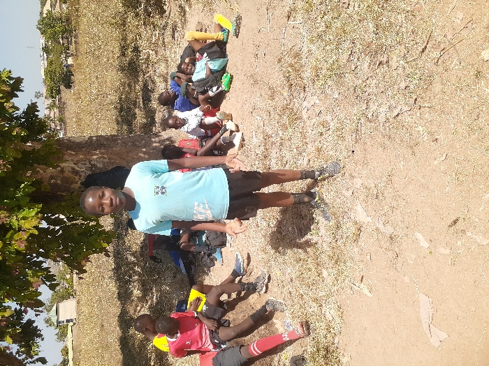 The image displays an outdoor scene in Jos, Nigeria, featuring eight male youths under bright daylight. A central male youth, estimated to be 10-15 years old, stands in the foreground, facing the camera. He wears a light blue short-sleeved t-shirt with a Nike logo and a small emblem, black athletic shorts, and dark sneakers with socks, his hands slightly open. Behind him, seven other male youths of similar age are resting on the dry ground in the shade of a large deciduous tree. Their attire includes various athletic wear: a red top with black shorts and red socks, a yellow top, and a light blue top with dark shorts and yellow leg coverings. Black backpacks and bags are visible near some individuals. The ground is characterized by dry, light brown earth with scattered patches of dry, light-colored grass and fallen leaves. The background features an open, dry field leading to distant low-rise buildings and sparse vegetation under a clear, pale blue sky. Strong overhead sunlight casts distinct shadows.